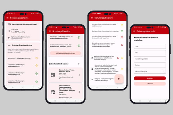 Einen Überblick über aktuelle BKF-"Module" und Fälligkeiten, erhalten Fahrer im Bereich Modulübersicht. Dort werden interne, sowie externe Schulungen nach Datum und/oder Fälligkeit angezeigt und der Fahrer über die Fälligkeit informiert. Die App ist einfach zu bedienen und kann auf allen Geräten problemlos genutzt werden.
