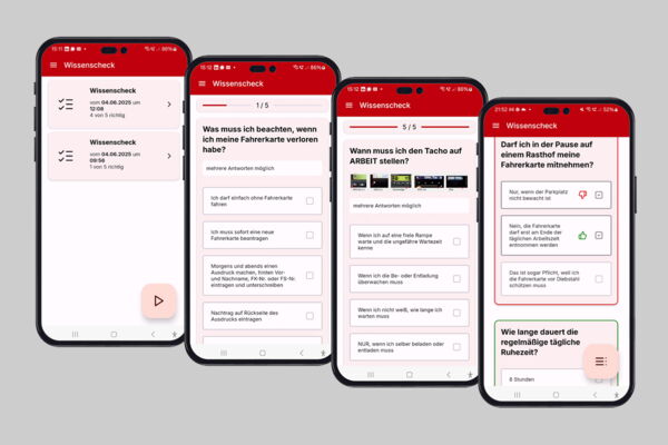 Ein besonderes Highlight der App ist der Wissenscheck, bei dem Fahrer ihr Wissen über wichtige Themen wie Sicherheit, Vorschriften und Technik testen können. Unternehmer können hierfür das zeitliche Intervall der Fragen vorgeben und werden danach informiert, ob sich eventuell Wissenslücken bei den Fahrern eingeschlichen haben. So behalten Vorgesetzte und Fahrer stehts den Überblick über das Wissen ihrer Fahrer.
