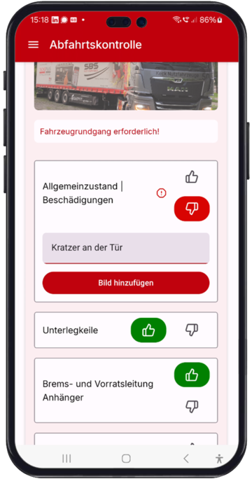 Diese Funktion bietet somit eine zusätzliche Sicherheit und Kontrolle für Unternehmer, um sicherzustellen, dass die Abfahrtskontrollen ordnungsgemäß durchgeführt werden und die Fahrzeuge in einem sicheren Zustand sind, bevor sie auf die Straße gehen.