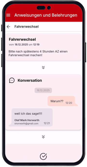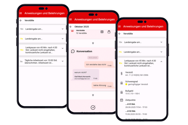 Arbeitsanweisungen werden zentral erstellt und digital über die App an Mitarbeiter verteilt. Der gesamte Prozess – von der Zustellung bis zur Bestätigung – ist revisionssicher dokumentiert und jederzeit nachvollziehbar. Belehrungen bei Regelverstößen können direkt, zeitnah und nachvollziehbar an Fahrer übermittelt werden. Die lückenlose Dokumentation dient als belastbarer Nachweis gegenüber Behörden und Prüfinstanzen.