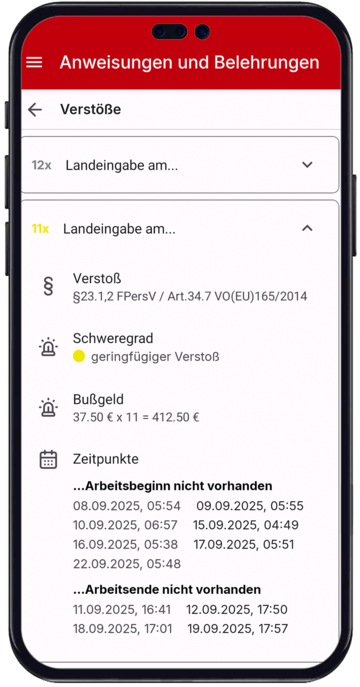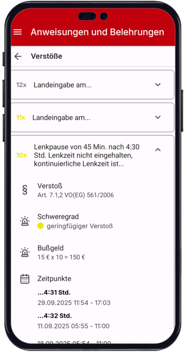 Mit den digitalen Anweisungen und Belehrungen lassen sich Arbeitsanweisungen sowie Belehrungen über Verstöße rechtssicher, effizient und nachvollziehbar über eine App verteilen. Mitarbeiter und Fahrer bestätigen den Erhalt per Unterschrift, Rückfragen können direkt beantwortet und sämtliche Vorgänge automatisch dokumentiert werden. Durch die zentrale Übersicht, die Überwachung des Rücklaufs und die automatische Übersetzung in 24 Sprachen entsteht eine lückenlose Nachweisführung gegenüber Behörden und Prüfinstanzen – für maximale Rechtssicherheit und transparente Kommunikation im Unternehmen.
