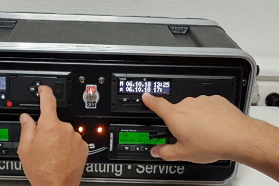 Trainer im Bereich der Fahrerweiterbildung können und dürfen sich nicht auf solche Informationen verlassen. Sie müssen sattelfest im Thema sein und auf jede Frage der Kursteilnehmer eine fundierte Antwort geben können. Dieses Knowhow erlangt man aber nicht mal so eben über Nacht. Und schon gar nicht durch reine Theorie- oder gar Onlineschulungen. Deswegen führt SBS Fleet-Competence seit Jahren zweimal pro Jahr die in Deutschland einmaligen Train-the-Trainer-Praxisworkshops durch. In dieser exklusiven Mischung von Theorie und Praxis lernen die Profis von Experten. Dazu stehen mehr als 100 digitale Trainings-Fahrtenschreiber sämtlicher Hersteller, Versionen und Generationen zur Verfügung. Mit den insgesamt weit über 600 Fahrtenschreiberkarten aller Arten, wie Unternehmens-, Kontroll-, Werkstatt- und Fahrerkarten, stehen den Teilnehmern alle Möglichkeiten offen. Sämtliche Aussagen können direkt mit und an den Kontrollgeräten getestet, demonstriert und deren Funktionen überprüft werden.